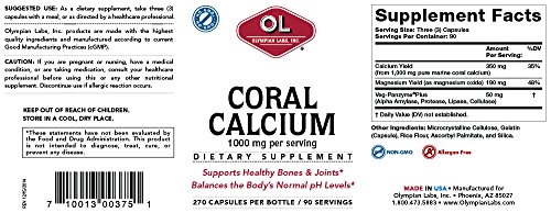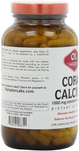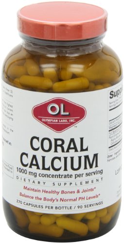 Enjoy Olympian Labs Coral Calcium - 1 g - 270 Capsules every day at these amazing prices! Our Coral Calcium is 100% pure marine Calcium. Scientific analysis of marine coral has shown that it is composed of Calcium, Magnesium, Sodium, Potassium, essential marine trace minerals and many other microscopic elements that may be essential to human life. Marine coral contains the biological 2:1 calcium/magnesium ratio in its natural state. (Please note: Description is informational only. Always read the product label before use and check with your health professional before using this product)Gluten Free: Gluten FreeDairy Free: YesFeature