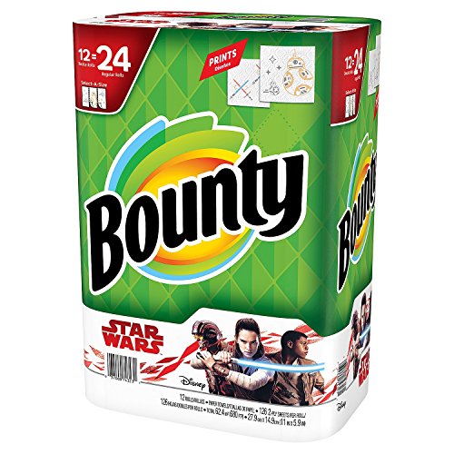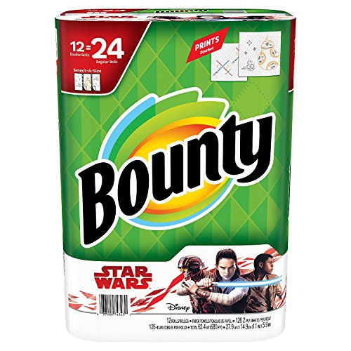 -. Brand : Bounty -. EAN : 0037000743231 -. Feature : Bounty P.R.Ints are still 2x more absorbent, so you can use less / Select-a-Size allows you to control just how much you use -. Label : Bounty -. Manufacturer : Bounty -. MPN : 980050480 -. PartNumber : 980050480 -. ProductGroup : Kitchen -. ProductTypeName : KITCHEN -. Publisher : Bounty -. Studio : Bounty -. Title : Bounty Select-a-Size Paper Towels, Star Wars Edition (12 Rolls) -. UPC : 037000743231