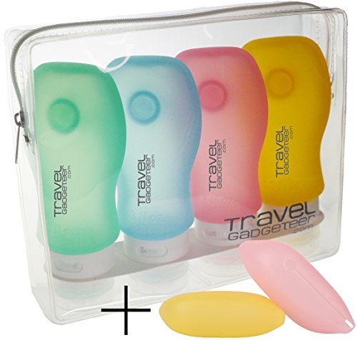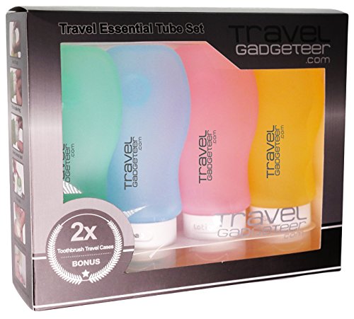 -. Brand : Travel Gadgeteer -. Department : unisex-adult (lage only) -. Feature : CARRY-ON APPROVED SIZE | TSA Approved for Carry-On Bags (4x) 3oz. (89ml) Bottles / QUALITY & LEAK PROOF | Soft, Durable, Flexible Squeezable BPA-Free Silicone - No Drip Valve and Leak Proof - Also Have Suction Cups to Adhere To Shower Walls / EASY TO FILL & EASY TO CLEAN | Wide Opening Makes These Bottles Easy to Use With Various Liquids - Their Also Top Rack Dishwasher Safe / HIGH QUALITY EVA POUCH | We've Equipped this Set with a Clear Rubber-Like Zippered (EVA) Pouch - Also Helps Reduce Spills / TOOTHBRUSH CASE BONUS | We Thought This Set Wouldn't Be Complete Without a Set of Silicone Toothbrush Cases -. ProductGroup : Apparel -. ProductTypeName : LAGE -. Size : 4-Piece Set -. Title : Travel Accessory Bottles (4) + TOOTHBRUSH CASE (2) + POUCH | TSA Approved