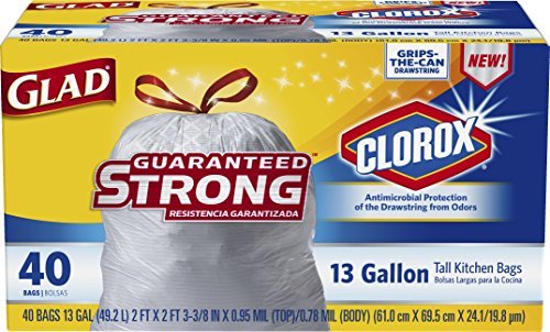 -. Title : Glad Tall Kitchen Bags with Antimicrobial Protection of the Drawstring from Odors, 13 Gallon, 40 count by Glad Indoor Trash
