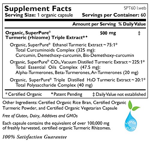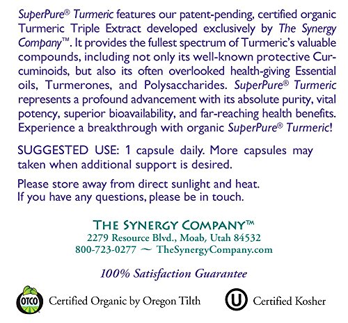 -. Binding : Health and Beauty -. Brand : The Synergy Company -. EAN : 0852971004347 -. Feature : Patent-Pending: Delivers the only whole-spectrum, certified organic, SuperPure® extract in the market / SuperPure® Extract Processing: Zero tolerance for chemical solvents and additives / Certified Organic, Non-GMO, Vegan, Allergen-Free & Kosher / Whole-Spectrum: 325 mg Curcuminoids , 47.5 mg Essential Oils/Turmerones & 40 mg Polysaccharides (per capsule) / Enhanced cellular permeability & retention confirmed via independent, double blind, cell line testing -. IsAdultProduct : 0 -. Label : The Synergy Company -. Manufacturer : The Synergy Company -. PackageQuantity : 1 -. ProductGroup : Health and Beauty -. ProductTypeName : HEALTH_PERSONAL_CARE -. Publisher : The Synergy Company -. Studio : The Synergy Company -. Title : Pure Synergy SuperPure Organic Turmeric Extract 60 Vegetarian Capsules by The Synergy Company -. UPC : 852971004347