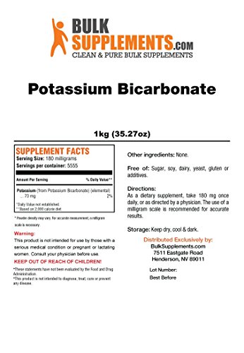 Studio : BulkSupplements Publisher : BulkSupplements Binding : Health and Beauty Product Description Potassium bicarbonate is a form of potassium that benefits heart, digestive, and muscular function. It helps regulate the body's pH balance and may also help relieve symptoms of potassium deficiency, such as muscle cramps, fatigue, and constipation. It is also used in the food industry as a buffering agent, in farming to neutralize acidic soil and prevent mildew growth, and as a fire suppression agent. 0