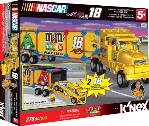 -. Feature : Build Kyle Busch's #18 M&M's Transporter Rig / Includes over 250 colorful durable plastic K'NEX pieces / 1:27 scale Transporter Rig replica measures 23 in length, large enough to hold 2 cars inside (sold separately) Features authentic sponsor logos and NASCAR hologram / Buildable Kyle Busch K'NEXman figure / Full color step-by-step instructions, recommended for builders ages 5+