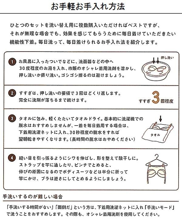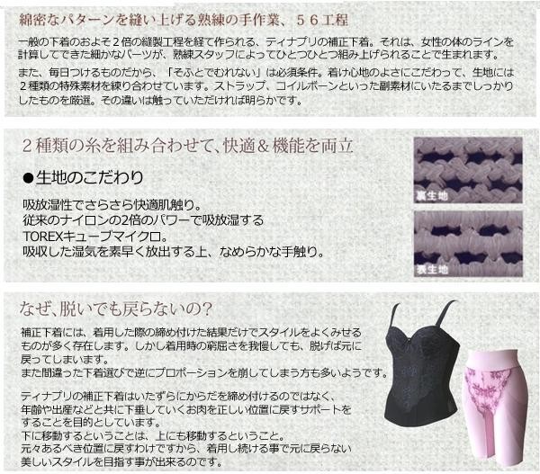 | ●補正下着が初めてという方でも楽々フィッティング。着用時は勿論、脱いだ後の体も美しくする為の矯正下着。 | | ●補正下着のホールド力と肌着のような優しさ。長時間でも着用できる着心地の良さを追求しました。 | | ●段差や黒ずみの原因のゴムはできるだけ排除。お肌に優しい素材にこだわりました。 | | ●ブラのストラップを幅広の帯でカバーし、肩への負担を軽減します。 |