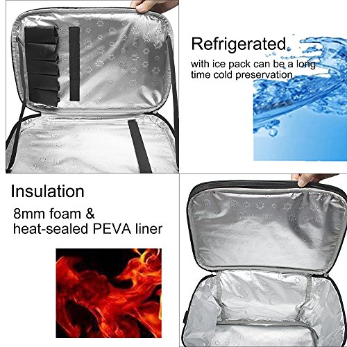- Dual compartment lunch bag:Separate insulated top compartment for additional food storage; front zippered pocket for utensils,bottom compartment providing a deep and spacious interior, enough space for packing your lunch needs.