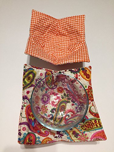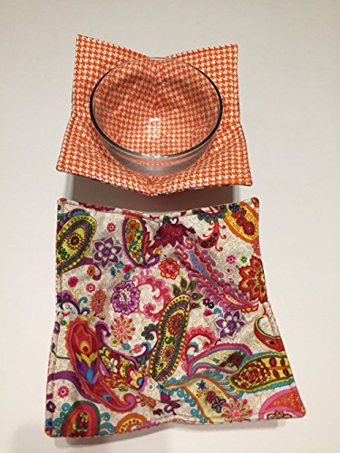 Product Description LISTING IS FOR QTY 1 BOWL COZY AS PICTURED - REVERSIBLE PRINTS (FRONT BACK) FRONT: BRIGHT Orange Pink Paisley BACK: Bright orange houndstooth Square corners Cereal Bowl size This is one of best ways to warm your food in the microwave. Simply place your bowl inside the microwave cozy, place it in the microwave, close the door. Push the timer (use 2 minute increments) and when ready, take out of the microwave with your bowl cozy hot pad. Or, when eating ice cream, place your bowl in the microwave cozy and it will keep your fingers from ice cold. The measurement of the cozy shown measures approximately 9 1/2"-10". Safe to machine wash dry. The bowls shown in the pictures not included. See our store for other color schemes and themes. Made in smoke free - pet free home 0
