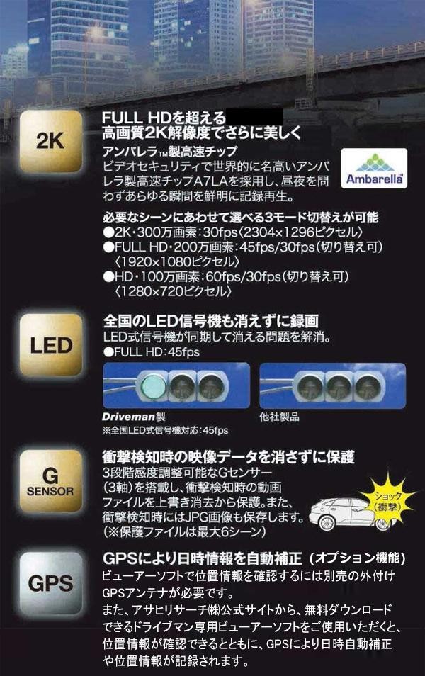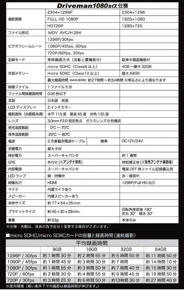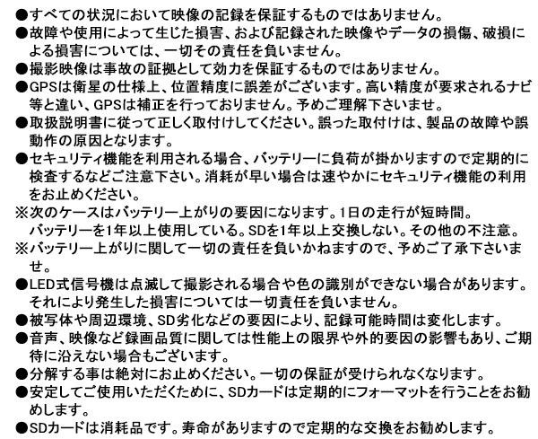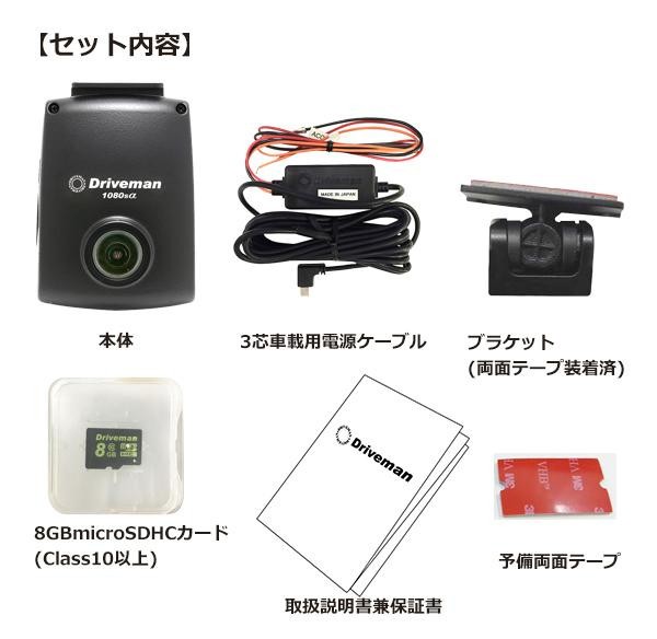 | セット内容 | 本体 3芯車載用電源ケーブル(約3m)+L字アダプタ ブラケット(両面テープ装着済) 予備両面テープ 8GBmicroSDHCカード(Class10以上) 取扱説明書兼保証書(保証期間1年) |