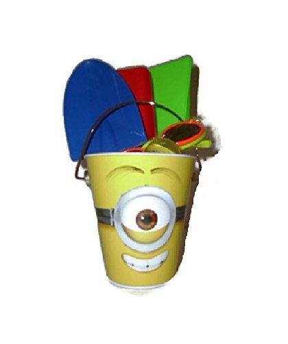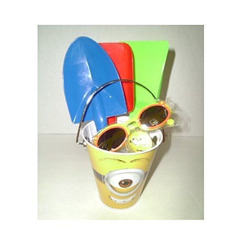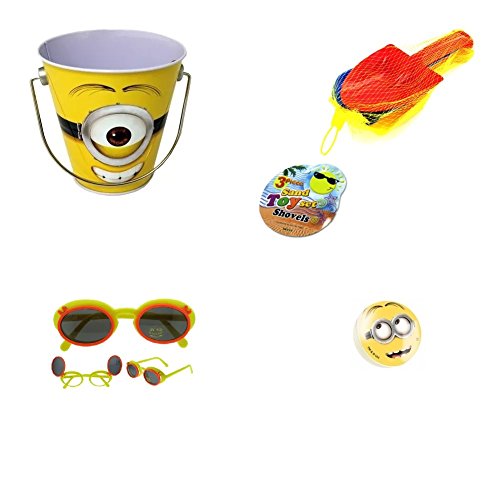 - Feature : Despicable Me Minion Tin Bucket Featuring the one eyed Minion Stuart / Bounce Ball feature images of Minion face / Set of 3 Shovels to build Sand Castles / Pair of Flip Open Sunglasses UV 400 Protection (color may vary)