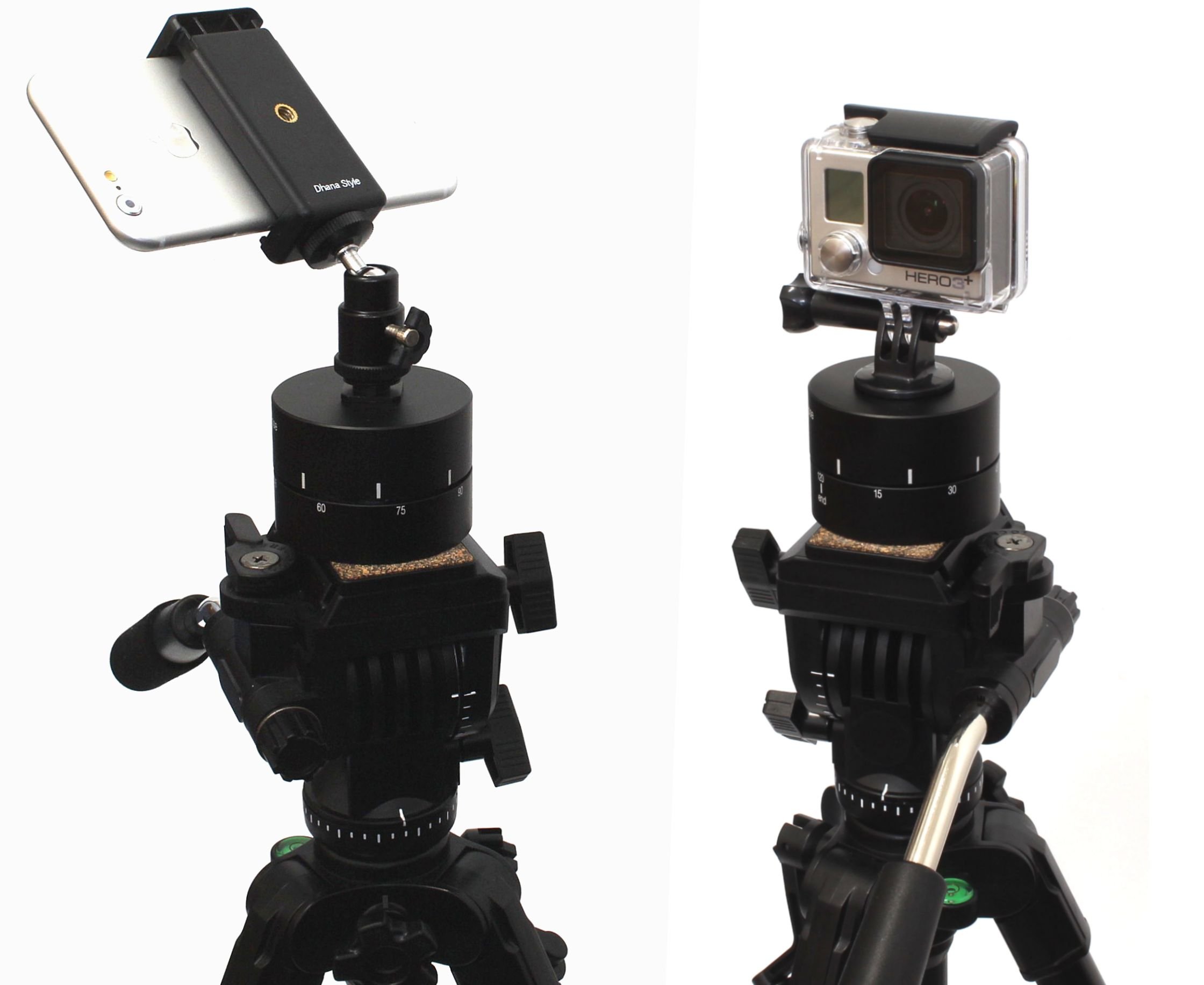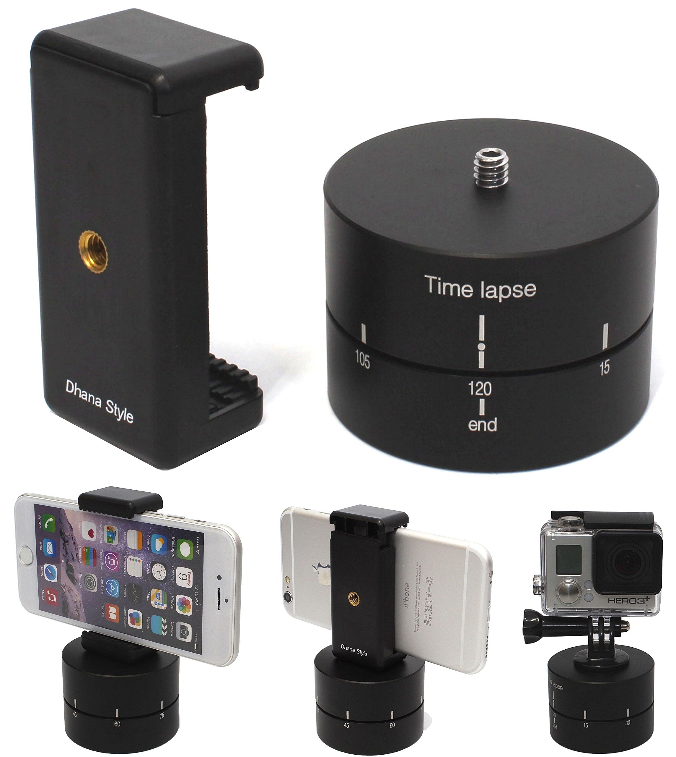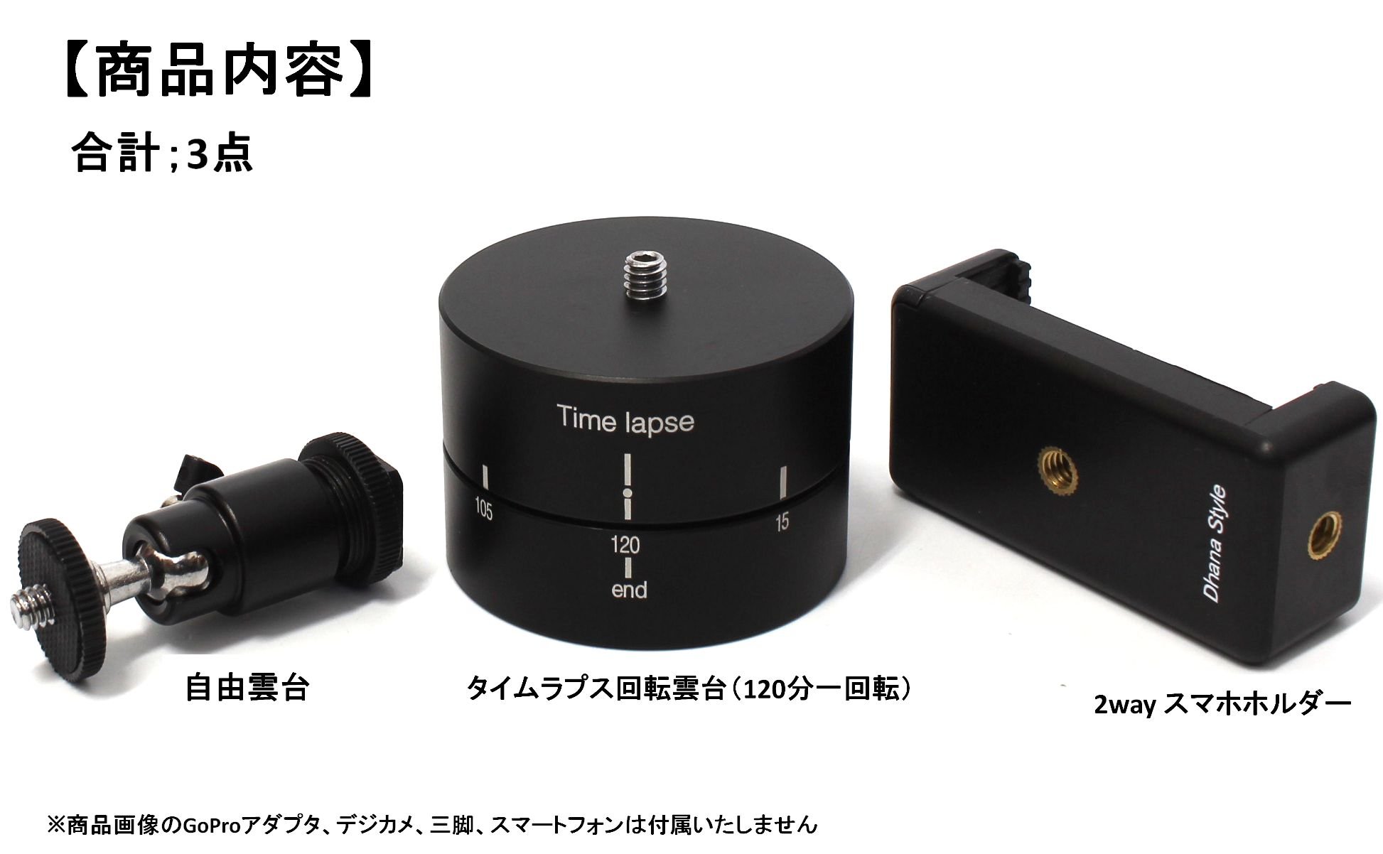 It becomes a set product of a rotary head that can perform time lapse shooting while rotating 360 ° with a smartphone, digital camera, Gopro, action camera, etc, a free head with angle adjustment width, a smart holder.