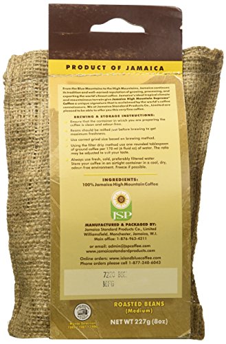 -. Binding : Grocery -. Brand : Island Blue -. Feature : 100% High Mountain Coffee Whole Beans / Vacuumed packed for freshness, with an outer burlap bag / Certified by Coffee Industry Board of Jamaica / Compares to Jamaica Blue Mountain Coffee / Grown in the hilly interior of Jamaica -. Label : Jamaica Standard Products -. Manufacturer : Jamaica Standard Products -. ProductGroup : Grocery -. ProductTypeName : GROCERY -. Publisher : Jamaica Standard Products -. Studio : Jamaica Standard Products -. Title : Island Blue 100% Jamaica High Mountain Coffee Beans