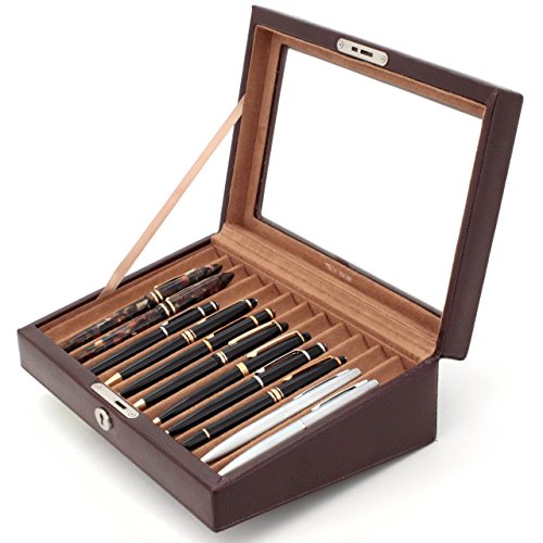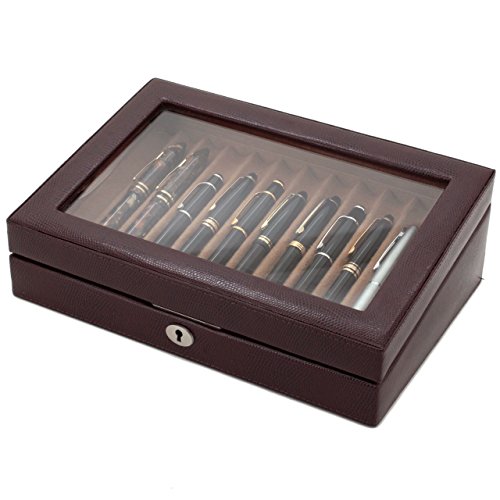 11 Pen Box for Fountain Pens, Writing Instruments Brown Texured Leather Constructed Box Pen Case Display Provides Ample Storage- Sloping Angle Easy to View with Glass Window-Lock & Key Protects, Stores, and Organizes up to 11 - Fine Pens, Curved Slots holds Pens in Place Complementary Microfiber Polishing Cloth- Complements Home Décor, plus Being a Great Gift Box Dimension: L 10.75" x W 7.25" x H 3 5/8" Compartment Wells: ¾ Compartment Length: 7"-Pens Not Included