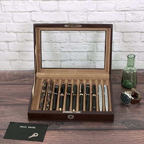Tech Swiss TS0432BRN- 11 Pen Box Display Storage Brown Leather Glass Lid Lock