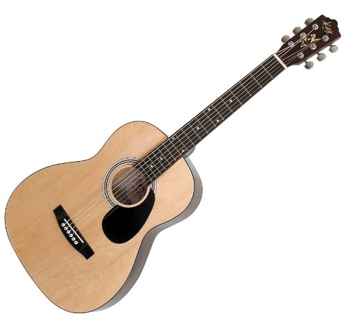 Covered chrome plated tuning machines (3 on each side) are individually capped worm and geared post for the internal gears. The tuning machines have a 12 to 1 gear ratio (turn the machine head button 12 times for the post make one complete revolution) which allows non slip accurate tuning that holds the tension of the strings to keep them in tune. German nickel/silver medium frets on the celluloid bound select quality mahogany fingerboard adds durability and easy playability. The slim steel reinforced mahogany neck includes inlaid pearloid markers to aid in proper fingering positioning. Selected book matched spruce top is laminated and is sealed with a high gloss polyurethane finish-so it doesn't check, crack or yellow. Complete with a celluloid bound body that has scalloped braced top with deluxe bracing for lasting construction, clear sharp sound and performance. A perfect smaller body student sized instrument.