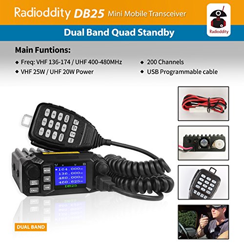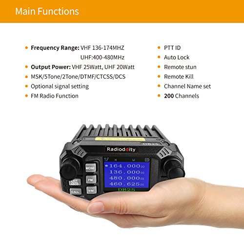 - ▼ MULTI FUNCTIONS: Radioddity DB25 is the latest car radio model of Radioddity, which features dual synchronized display mode, mic audio gain setting, alarm function, DTMF function(2/5 tone), auto power off, channel mode editing setting, auto scan, scanning resume, variable frequency scanning, quad watch delay time, randomization privacy mode, etc.