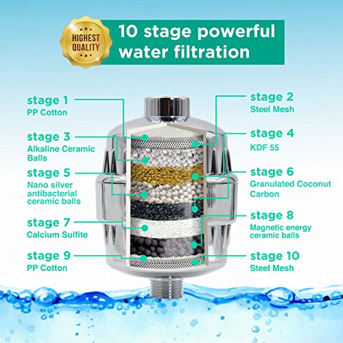 PURIFY YOUR WATER IN 10 STAGES & GET BONUS HAIR STOPPER: Steel Mesh on 2 ends: protects layers, filters dust & particles. Granulated Coconut Carbon: removes radioactive I-131, chlorine, & more chemicals. 2 PP Cotton layers: remove sediments, rust & bacteria. KDF 55: removes heavy metals & sulfur (H2S). Calcium Sulfite: removes lead, mercury, cadmium & aluminum. 3 layers of Alkaline, Magnetic and Nano Silver Ceramic balls: revitalize water, kill bacteria, toxins & rejuvenate skin, hair & nails.