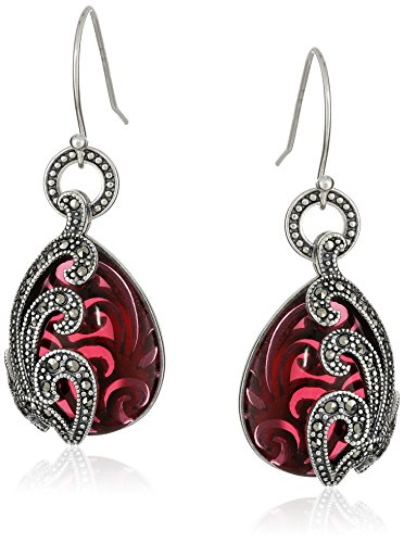 Elegant dangle earrings featuring pear cut garnet-tone glass beads encased in oxidized sterling silver with marcasite accents