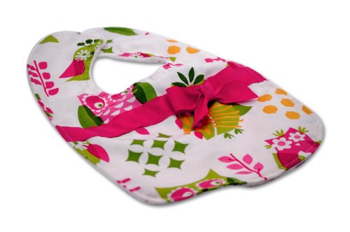 Girls baby bib with 100% cotton pink and green owls with a magenta ribbon on the front and cream minky dot on the back. Caught ya Lookin's baby bib offers a chic look while providing comfort and keeping baby clean. Baby bib is 100% cotton, the minky is silky soft, and both are easily cleaned. Reversible. One size. Machine washable. Made in USA.
