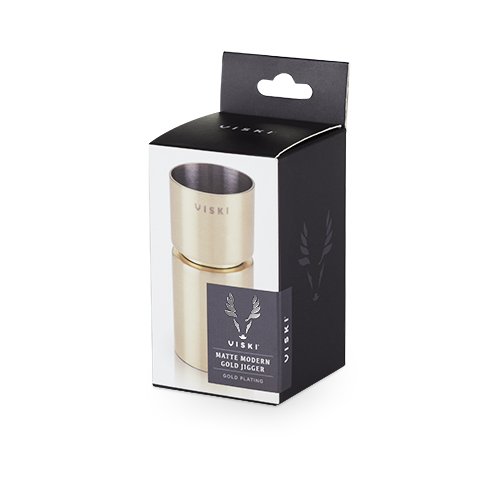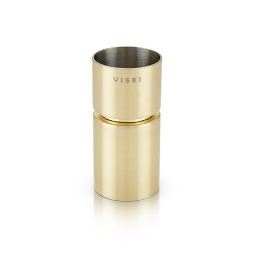 Studio : Viski Publisher : Viski Binding : Kitchen Product Description Durable stainless steel barware meets a handsome modern design in this cylindrical double jigger. Brushed matte Gold with a deep groove wreathing the center is assiduously laser-etched, delineating accurate 1- and 2-ounce measurements and ensuring the perfect pour. 0