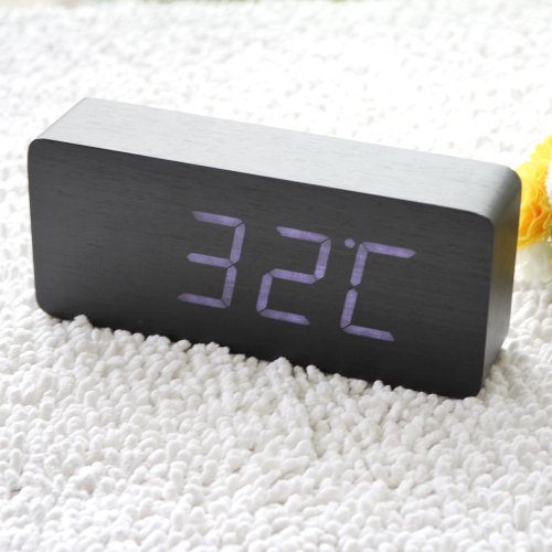 Eiiox Rectangular Wooden Alarm Clock Black with White LED Display of Thermometer-Sound Activate