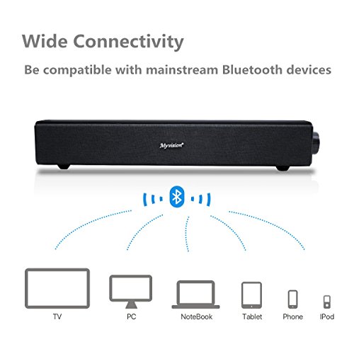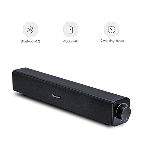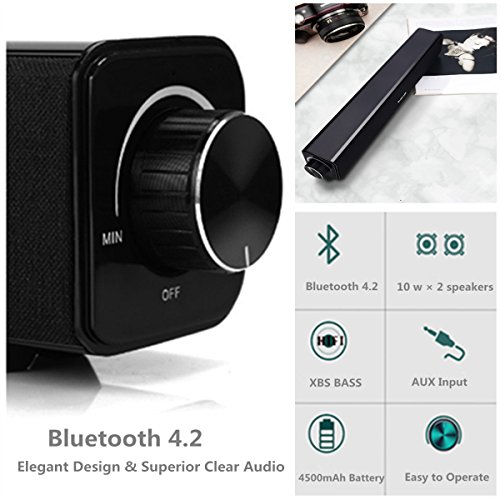 -. Feature : 【Bluetooth 4.2】: Be compatible with mainstream devices, such as smart TVs, laptops, Tablet PCs and cellphones; the effective distance more than 10 meters. / 【Super Clear Audio】: Two speakers and two bass amps. Built-in two bass amplitudes create vigorous bass experience. / 【DSP Bass Technology】: Rich, powerful bass transforms movies, music, and TV into an explosive experience. Bass boost, rich layers. / 【2.1 Sound Bar System】: Delivering booming sound with crystal-clear audio quality, this soundbar brings an enticing home theater experience to the comforts of your home. / 【Rechargeable & Durable Battery】: High efficiency built-in 4500mA rechargeable and durable lithium battery ensures much longer working time up to 12 hours if fully charged.