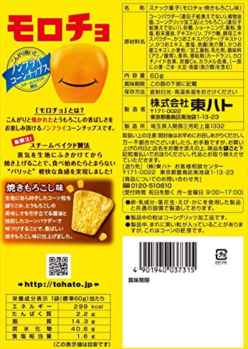 原材料:コーンパウダー(遺伝子組換えでない)、植物油脂、コーングリッツ加工品(とうもろこし(遺伝子組換えでない))、砂糖、ショートニング、澱粉、食塩、粉末醤油、デキストリン、ブドウ糖、酵母エキスパウダー、かつおエキスパウダー(デキストリン、かつおエキス、食塩、魚醤(魚介類)、かつお節エキス)、小麦粉/加工澱粉、乳化剤、調味料(アミノ酸等)、香料、増粘剤(カードラン)、カロチノイド色素、炭酸Ca、カラメル色素、(一部に小麦・ごま・大豆・魚醤(魚介類)を含む)
