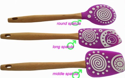 - Feature : For Home cooking enthusiasts and professional chefs: Perfect for All Your Cooking & Baking Needs and the Ideal tool for Scraping, Flipping, Stirring, Scooping, Folding, Mixing and Turning / Long, strong and comfortable slip-free wooden handle. / Durable and High Heat Resistant: safe for using with hot foods, oven and around the cook top. Plus, you needn't worry if you leave your spatula leaning against a hot pan because "it won't melt." / Non-sticky, attractive, and Dishwasher safe. Perfect for using with nonstick cookware and bakeware. / Food grade silicone, eco-friendly, non-toxic and tasteless. Comes on 3 different flexible silicone head shapes, each suits for a different purpose.