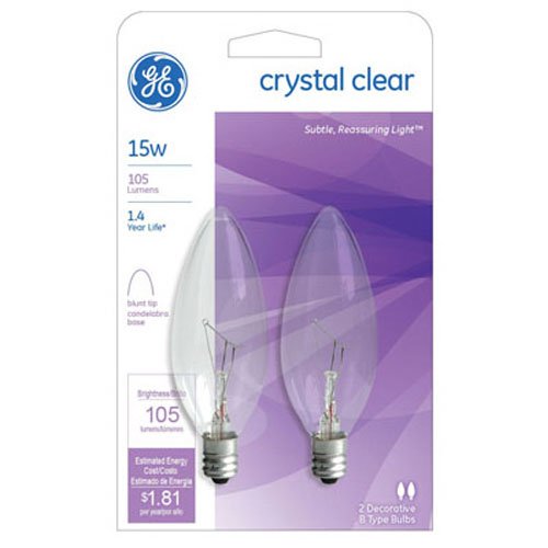 - It is GE 15BC/CD2-TP6 2 Pack 15W 120V Blunt Tip Candelabra Bulb 105 Lumens 2 500 Kelvin