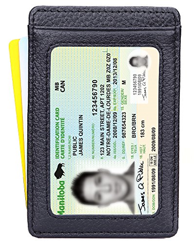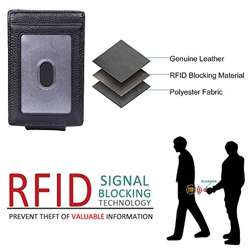 -. Feature : Made of Soft Embossed Full-Grain Leather, 3 card slot, 1 ID window, 1 Change/card Pocket, 1 magnetic clip for bills, very compact in your pocket. Wallet size: 4.3" x 2.8" x 0.1" (11cm x 7.1cm x 0.3cm); / Ultra Slim and minimalist: Fit Front/back pocket well, with snug card slots. Thumb hole in the ID window makes it easy to slip out ID. Slim profile, comfortable and works great. / Money clip, Made with 4pcs Powerful RARE EARTH Magnets, Magnetic clip works well with folded cash and is very strong to hold 30 bills, better than others with only 2pcs magnets. / RFID Blocking Function, protect your vital information from being stolen, allows your cards securely. Does Block 13.56 MHz Frequency (Credit cards, debit cards, driver license and ID cards). Does NOT Block 125 KHz frequency. / Great front pocket Wallet for Men, Holds plenty of cards and cash, compact, good stitching and durable.