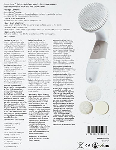 Dermabrush Micro-Massage Handle: rubber middle section provides slip free grip; water resistant for use in or out of the shower (not submersible); rotates in a circular motion to deliver gentle, deep cleansing action; loosen and remove dirt, oil and makeup