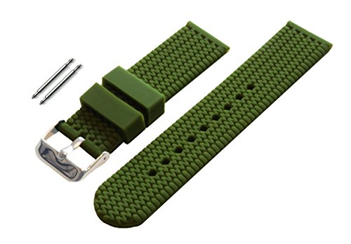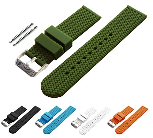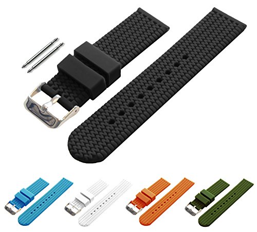 Fabricated from high tensile silicone rubber to meet our lofty standards for fashion, function and fit. Includes two extra stainless steel spring bars, but will also work with existing spring bars for most watches. To determine proper width for your watch, measure lug width where current band attaches. Spring bar tool (available on Amazon) will facilitate process, but can be done without.Feature