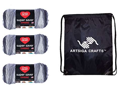 Red Heart Super Saver Ombre Yarn (3-Pack) Anthracite E305-3964 with 1 Artsiga Crafts Project Bag