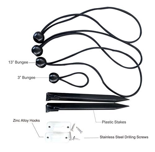 Light weight, soft touch, easily install and take off, include 2 plastic stakes, 1-3" and 3-13" bungee, 2 pieces of Zinc alloy hooks and 4 stainless steel drilling screws