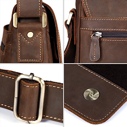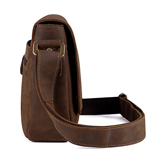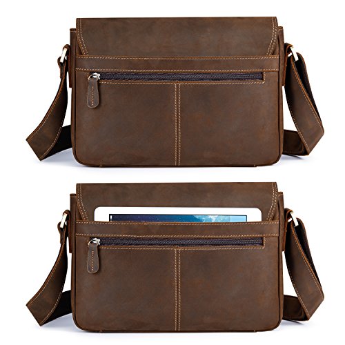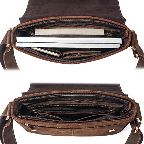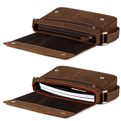 -. Feature : 100% brand new & high quality. Kattee is an US registered trademark, unauthorized sale without permission; we will investigate for legal responsibility. Please pay attention to avoid purchasing counterfeits from other seller / Made by vintage genuine dark brown cowhide leather with durable bronze tone hardware / Front and back exterior with wall zipper pocket, and has a flap cover with magnetic snap to keep your asset safe / There is a main compartment equipped with top zip closure, which is big enough to hold IPAD AIR , textbooks, wallet, phone etc; 2 open wall pockets; 1 wall zipper pocket / With adjustable shoulder strap, this leather messenger bag can be used as Single-shoulder bag and Briefcase