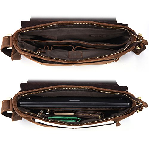 -. Feature : 100% brand new & high quality. Kattee is an US registered trademark, unauthorized sale without permission, we will investigated for legal responsibility. Please pay attention to avoid purchasing counterfeits from other seller / Made by waxed genuine dark brown cowhide leather with durable bronze tone hardware / The front and the back are both designed with 2-way zip closure / There are 3 main symmetrical compartments, which are big enough to hold 15" Laptop, IPAD AIR, A4 magazine, textbooks, wallet, phone etc; 3 pen loops; 2 open wall pockets; Front and back exterior with 1 wall zipper pocket / With adjustable shoulder strap, this leather messenger bag can be used as Single-shoulder bag, Briefcase and Laptop bag