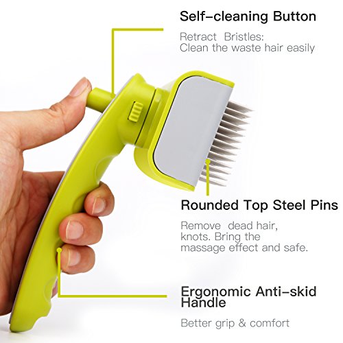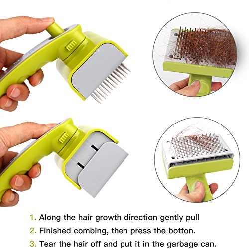 Quick Self-cleaning Button Retract Bristles: Press the top button that slides a flat plastic piece over the bristles and pushes all the hiding hair off with seconds. Easily wipe the dead hair off and removes tangled knots