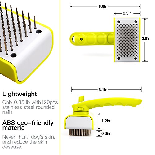 Adjustable Comb Bristles’ Length: Please control the stainless steel nails bristles length ranges from 0.1 to 2 inches by the top button as your pets needs. It is good for all size cats and dogs rabbits with short/ long/ thick/ thin hair