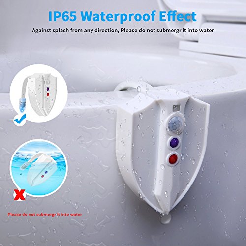 - 【UV Sterilization Light】-- The toilet light is not just a night light, it comes with an UV sterilization lamp, which can easily kill 99.9% of bacteria and viruses without using any chemicals, keep your toilet cleaner and safer (120 seconds disinfection). It always works automatically after colorful LED turns off, stays on for 25 seconds and off for 5 seconds, the mode will repeat 4 times and overall takes 120 seconds. Note: It will turn off at once when detecting movement and LED colorful light