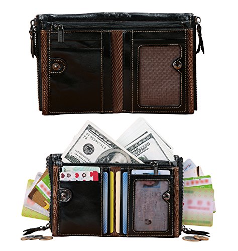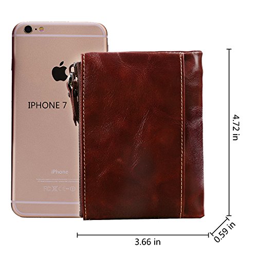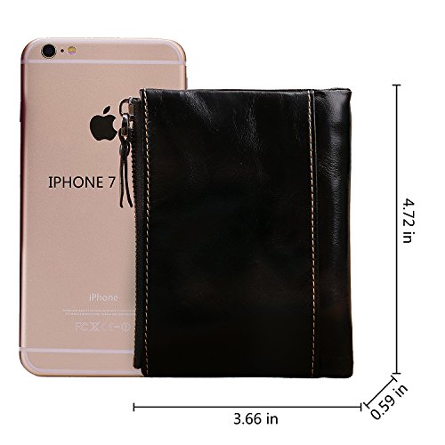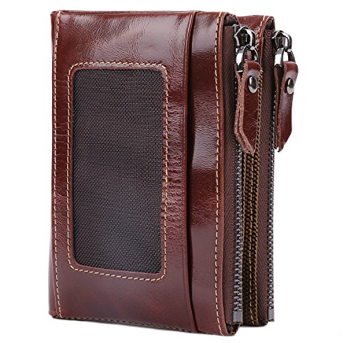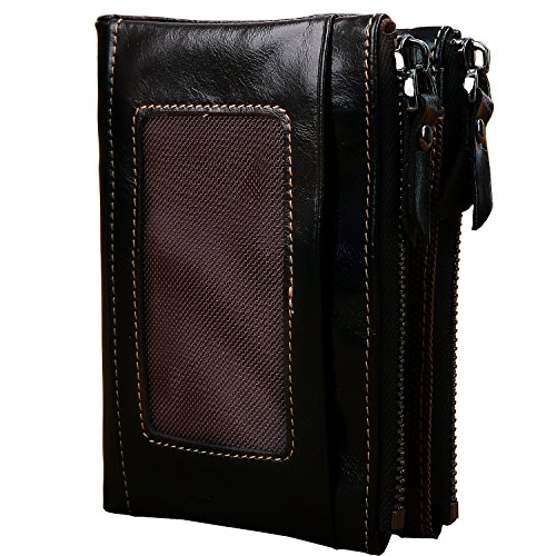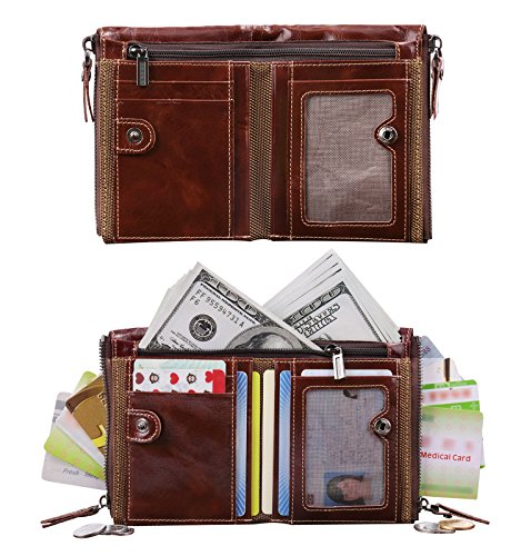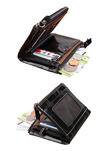 -. Feature : SAFETY & P.R.IVACY - Our wallets are equipped with advanced unique proP.R.Ietary blocking material , which blocks RFID signals and protects the valuable P.R.Ivate information stored on RFID chips from unauthorized scans. This keeps your vital information in Your Credit cards, Debit cards, Banking Information, Smartcards, RFID driver's licenses and other RFID Cards from being stolen. / GENUINE LEATHER - Made of high quality Cowhide Genuine Leather with waxed finish. Compact yet small enough to put into your bag. Comes With 6 Credit card slots and 1 photo slot, 1 ID window, 2 coin zippered pockets, 1 full-length compartment to put money, 1 long zippered pocket for change and coin inside, 1 pocket with snap button for change. Roomy enough for fitting plenty of cards, change and some bills, Coins, keep them well organized. / CLASSIC FUNCTIONAL DESIGN - Measure 4.72" x 3.66" x 0.59" in. As the bill section can hold up 40 pieces of dollar bills. And the snap stays shut. Carrying the items necessary while travel, holds a lot without being bulky. Best choice for avoiding bulky looking wallets. Longer time we use, nicer it becomes. / FUNCTIONAL FOR YOUR BUSY LIFE - Use them every day to Shield against unauthorized RFID, NFC scans as reported in the media -- Use them if you spend time vacation or live overseas -- Protect yourself from strangers in public places -Great while using public transport or just in public places / NO HASSLE MONEY BACK GUARANTEE - We know you'll love our wallet as much as we do, If for any reason you're not 100% SATISFIED, let us know and our customer service team will make things right: full refund or a free replacement, whichever you prefer.
