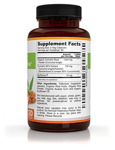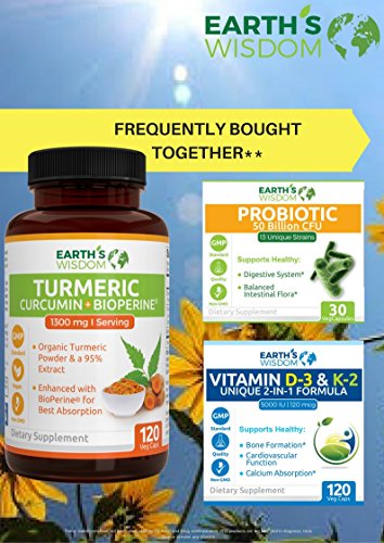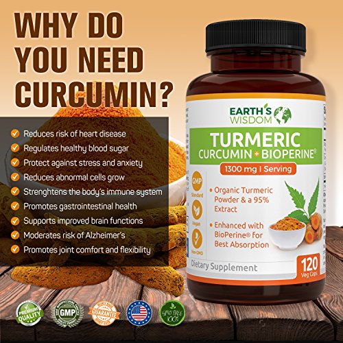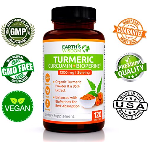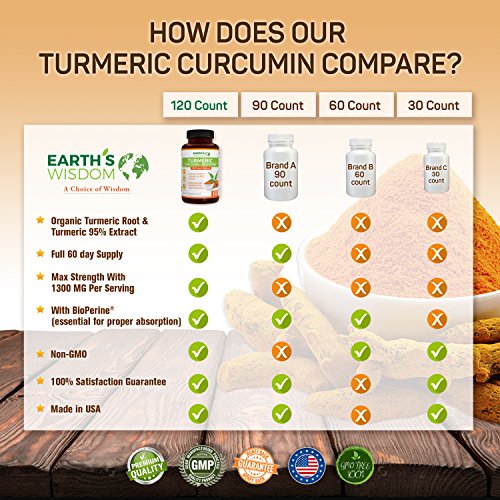 -. Feature : EXTRA STRENGTH ORGANIC TURMERIC PILLS ENHANCED WITH BIOPERINE: Earth's Wisdom Premium Turmeric Formula Has 1300mg of Organic Turmeric Curcumin With 95% Standardized Curcuminoids Per Serving (Highest Potency) And 10mg of BioPerine (Black Pepper) For Enhanced Absorption And Bioavailability. / QUALITY IS OUR PLEDGE - We Offer 100% Natural Supplements With Non-GMO Ingredients, Produced At cGMP Certified And FDA-approved Facilities In The USA. With one bottle you get a 2 (two) month supply of best quality product on the market today. Our Turmeric Curcumin Contains No Gluten, Soy, Milk, Egg, Shellfish, Corn, Wheat, And Peanuts. No Artificial Preservatives, Fillers, Or Ingredients. / MONEY-BACK GUARANTEE - We Are So Confident In Our Product That We Are Willing To Offer 100% Money-Back Guaranteed Should You Be Less Than Satisfied. Your Body Has Nothing To Lose But a Lot To Gain!