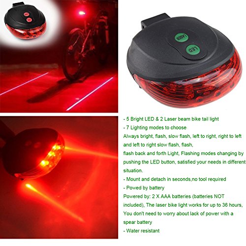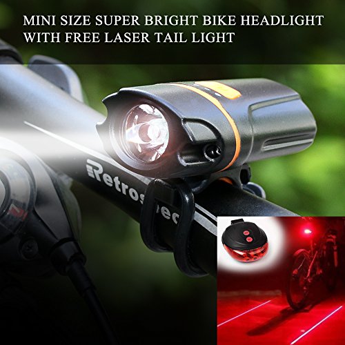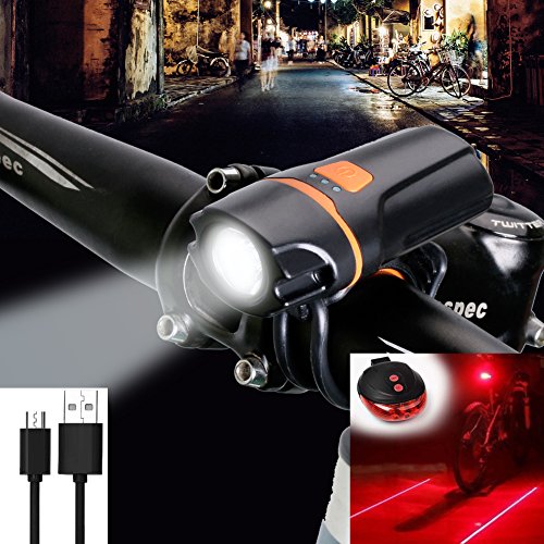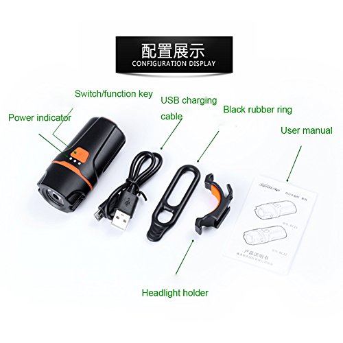It is SUPER BRIGHT, LIGHTWEIGHT(50g), and STYLISH, GUARANTEE! The price is perfect for someone who is looking for a bright inexpensive light to ride at night or for commuting! USB Rechargeable - Charges from your computer or any device with a USB port. Smart Charging - 2 hours charging time - Automatic, fully charged cut-off system - Smart charging ensures longer battery life Simple control button - Conveniently located on top of the light for easy access 6 Lighting modes -Strong/Medium/Low/Strobe/Slow flash/SOS ILLUMINATION MODE: THE SWITCH MODE: Press switch: Strong-?Middle-?Weak-?OFF, according to this cycle. Quick double press the switch: Strobe(10Hz)-?Slow flash(1Hz)-?SOS, according to this cycle. Long press switch 3 seconds into the constant current mode, the power indicator light flashes, the main light flash three times, the brightness is always constant. BATTERY INDICATOR: Product usage: Three lights all bright: battery power >70%; Two lights all bright: 70% > battery power >40%; One light bright: 40% > battery power >10%; One light flash: battery power < 10%; Package: 1x Bicycle headlight 1x Headlight holder 1x Micro USB charging cable 1x Black rubber ring 1x Free laser tail light(2XAAA battery not included) 0 |