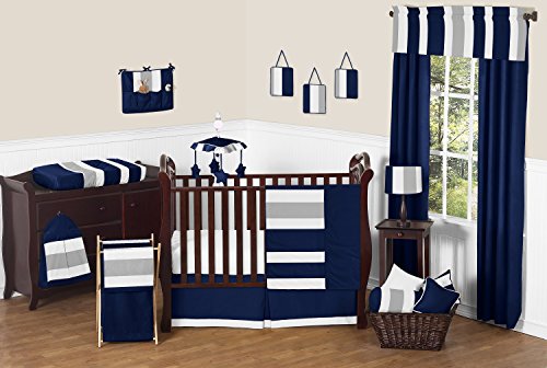 -. Title : Modern Navy Blue and Gray Stripe P.R.Int Boys Baby Bedding 11 Piece Crib Set without bumper