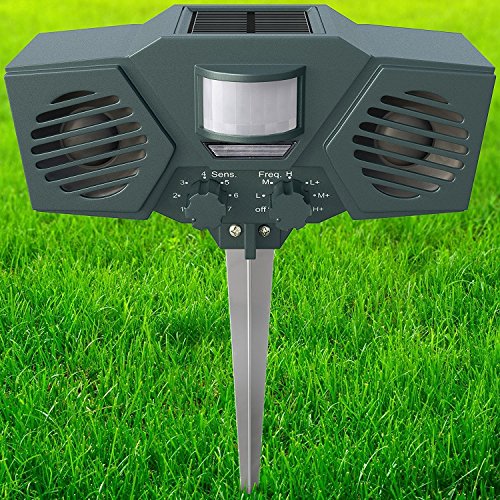 -. Feature : GET RID OF ALL ANIMAL INTRUDERS - Blasts all animal intruders out of your property by emitting powerful ultrasonic sounds and flashing LED lights. Eliminate roaming pest animal problems with this aggressive ultrasonic and flashing light animal repeller. Features three (3) ultrasonic frequency settings, plus an optional on/off LED flashing light. / HOW IT WORKS - Blasts a range of powerful ultrasonic sounds and flashing LED strobe lights to scare away a wide variety of pests. / SOLAR POWERED & EASY TO INSTALL - Simply take it out of the box, stick it into the ground with the included metal stake, and select your desired settings (features 3 ultrasonic frequency settings, an optional on/off LED light, and 7 sensitivity settings). Features a solar panel on top of the device that recharges the batteries (3 AA rechargeable batteries included). / Can also be recharged via USB (A USB charging cable is included). / HUMANE & ENVIRONMENT FRIENDLY - No messy chemicals or pesticides, no traps, no dead animals. Get rid of all animals through emitting a mixture of ultrasonic sounds and powerful flashing LED strobe lights, frightening the intruding animals and pests to leave the area. / WEATHERPROOF & WATER-RESISTANT - Solid hard plastic construction for withstanding years of rain, snow, ice and wind. Perfect for yards, patios, driveways, garages, attics, porches, boats, gardens, farms, ponds, etc. / PIR Motion sensor: Detects motion from up to 30 Ft. / Size: 6" x 3.5" x 2" / New Upgraded components for optimal performance.