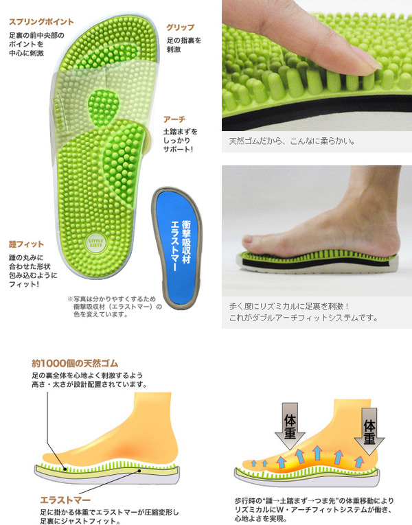 ポリエステル:インソール:天然ゴム、ミッドソール:エラストマー、ソール:EVA
