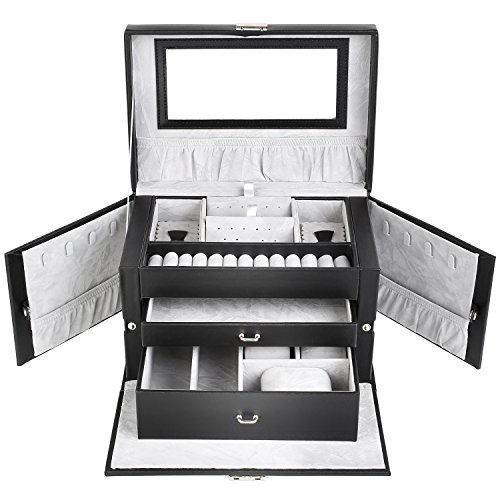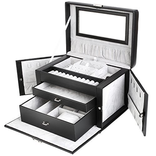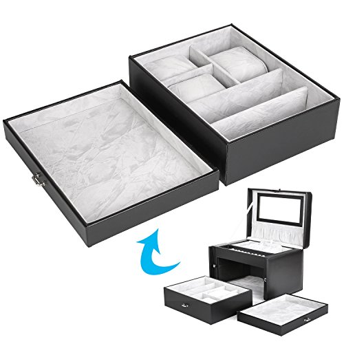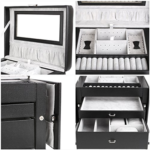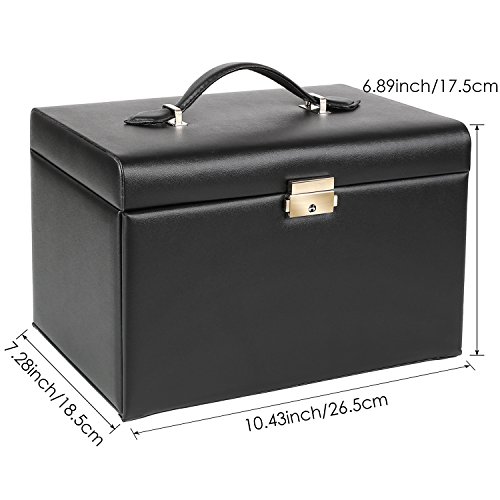 MVPOWER Jewelry Box Faux Leather Travel Case, Jewelry Display Organizer with Lock and Mirror for Gift, Black