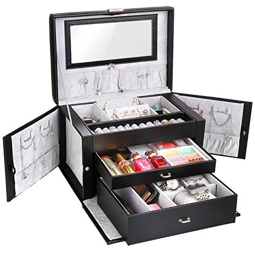 - Made of quality black faux leather and soft velvet, this jewelry box is superexcellent to protect your beloved jewelry from scratch and damage. It give you an exquisite way to display your jewelry.