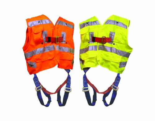 -. Feature : Three Steel D-rings: at back and hips / Parachute mating buckle on chest and leg straps / High-visibility orange vest / Made of polyester / Fits medium to X-large