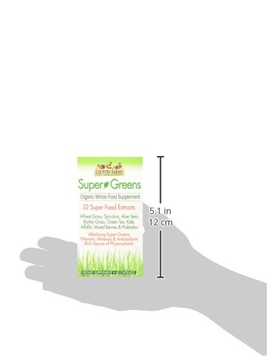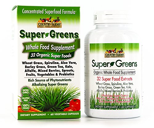 ReleaseDate : 2015-10-22 Studio : Country Farms Publisher : Country Farms Binding : Health and Beauty Product Description Health experts estimate that only 1 out of 10 Americans consume the amount of fresh produce that they need each day! Country Farms Super Greens Vegetarian Capsules provide the goodness of real, organic whole food fruits, vegetables and superfoods with the convenience of an easy-to-swallow vegetarian supplement! Each serving contains a powerhouse of 32 superfoods, with organic, whole food fruits and vegetables including wheat grass, kale, barley and mixed berries. In addition, Country Farms Super Greens is an excellent source of fiber, a probiotics and enzymes. Just one serving of Super Greens VegiCapsules is designed to help you meet your nutritional needs and daily goals for fruits and vegetables. Country Farms are convenient, easy-to-use supplements that help restore daily consumption of essential fruits, vegetables, greens, sprouts, seeds and superfoods that Mother Nature intended us to enjoy. 0