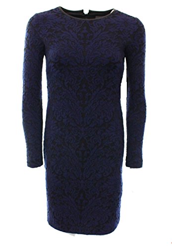 Long-sleeve dress in damask-inspired pattern featuring faux leather trim at neck and back skirt split