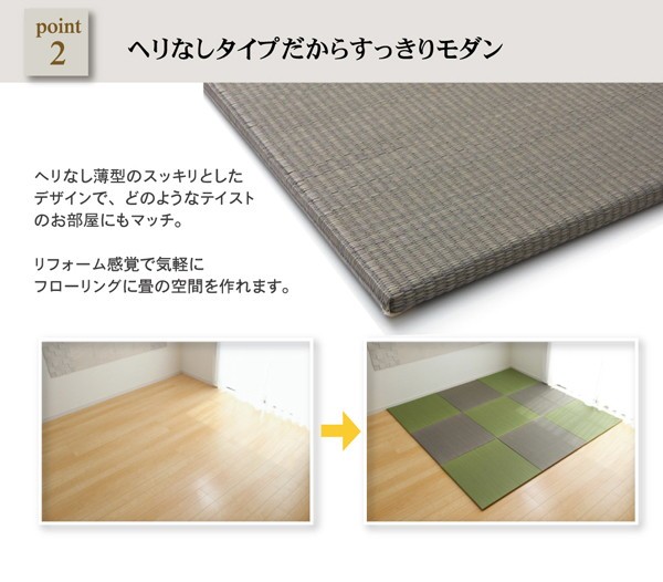 無地のユニット畳(置き畳)です。フローリングのお部屋に敷いていただくだけで、和の空間をつくり出すことができます。シンプルなデザインでカラーバリエーション豊富な商品のため、お部屋や家具に合わせやすく、和のテイストながら洋室の雰囲気を崩さずにご使用いただけます。中材にはクッション性のあるウレタンフォームを使用することにより、ふかふかとしたふみ心地と、収納の際も軽量で持ち運びも簡単です。裏面には畳と畳を連結できるよう滑りにくいジョイントを付属しております。サイズも70センチ角のため、ラグと近いサイズにすることにより、上にラグを敷いても使用いただけます。