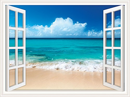 Walls 360 Peel & Stick Wall Decal Window Views Ocean Beach with Fluffy Clouds in Sky (12 in x 9 in)